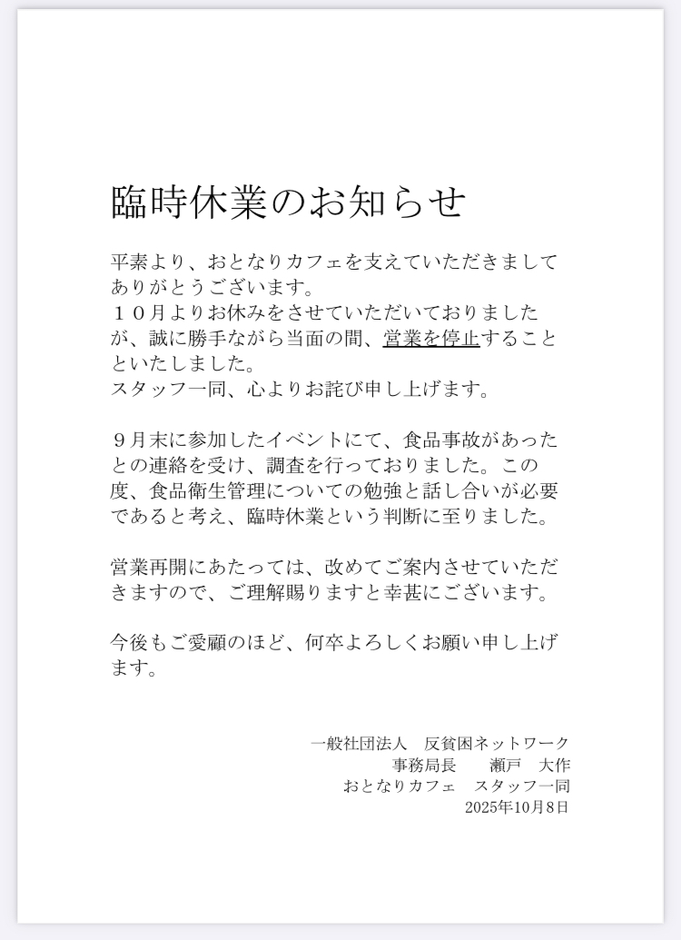 9月末に参加したイベントにて、食品事故があったとの連絡を受け、調査を行っておりました。この度、食品衛生管理についての勉強と話し合いが必要であると考え、臨時休業という判断に至りました。
