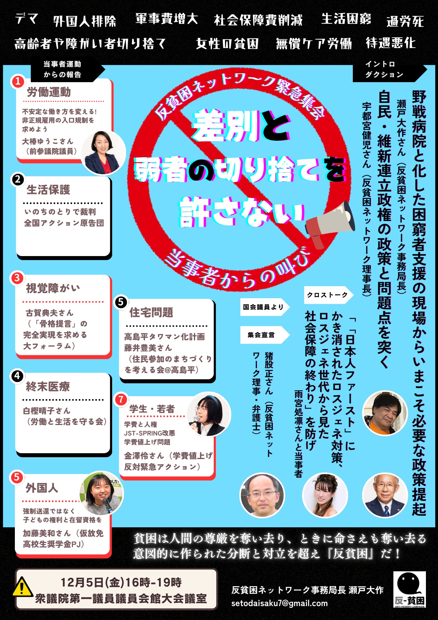 根拠のない差別的な言説に基づく外国人排除政策の強化は、困窮者、高齢者、障がい者など、社会的に弱い立場の人々への「切り捨て」を加速させます。