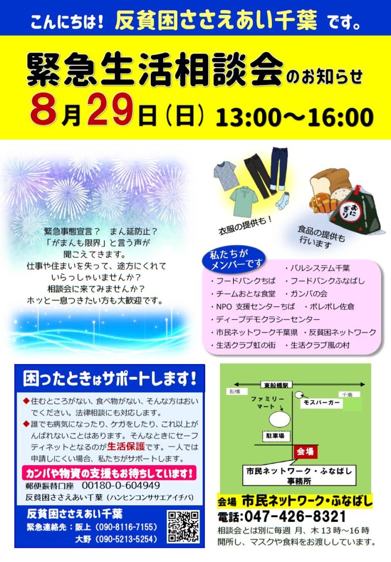 反貧困ささえあい千葉 緊急生活相談会@東船橋 8/29 13:00~16:00 …