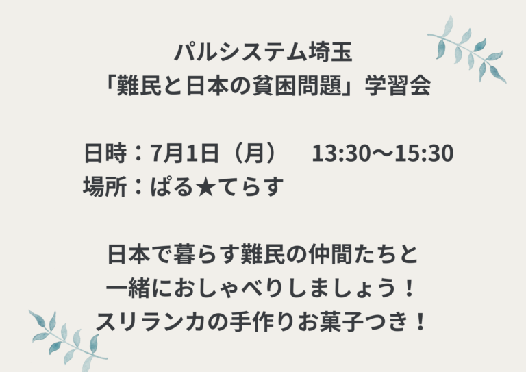 7月1日(月)にパルシステム埼玉の「難民と日本の貧困問題」学習会に事務局長の瀬戸と難民の仲間たちが登 […]