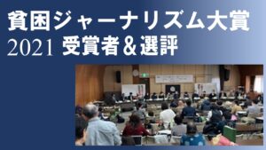 貧困ジャーナリズム大賞:取材される側の当事者や専門家の側から見た報道の評価を年に1度社会に示します。社会が抱える貧困の問題において隠されていた真実を白日の下にさらしたスクープ報道、綿密な取材で社会構造の欠陥や政策の不備を訴えた調査報道、地道な努力で問題を訴え続けた継続報道などが対象です。