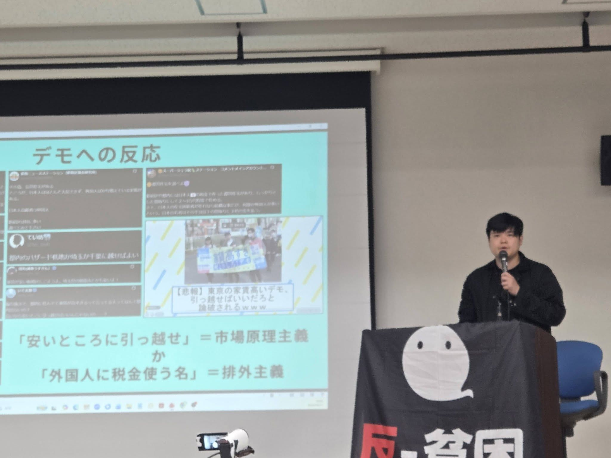セッション四は住宅問題に関する報告、最初は尾林哲矢さん(首都圏青年ユニオン委員長)から「若者主体の労働運動と家賃を下げろ」をテーマに報告頂いた。「貧困問題を解決すためには労働運動との結合は必須、人権問題や入管問題に取り組む学生たちと多く交流する場がありますが労働運動への関心や知識に弱さを感じていました。反貧困ネットワークがSOS対応する若い人々も労働者の権利や闘う事が出来る事を知らずに雇止めされホームレスまでに至る、連携が益々必要になっている、尾林さんたちが取り組んだ「家賃を下げろデモ」での政策要求を私たちも連帯して取り組んでいきたい。