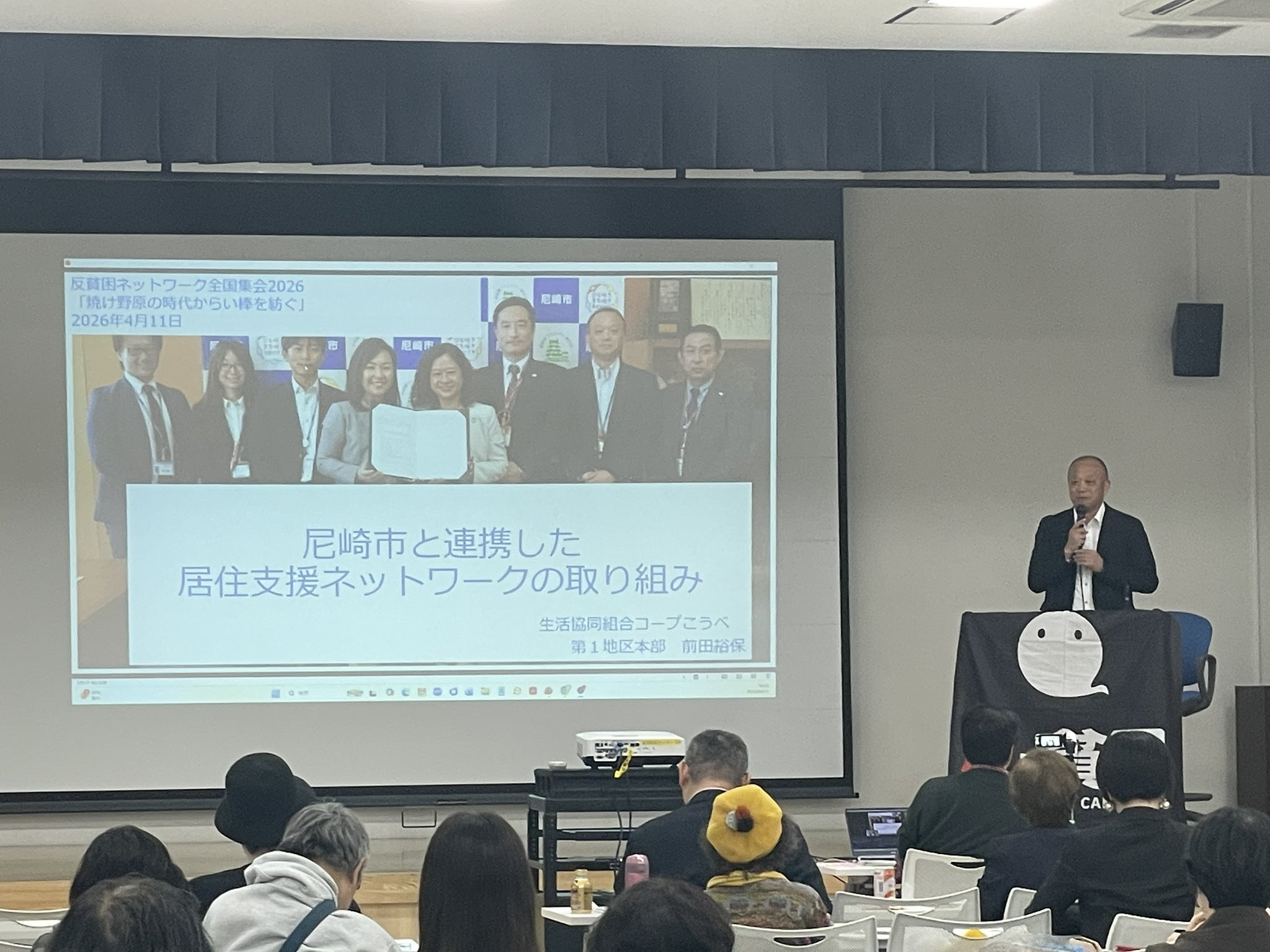 次に「尼崎市と連携した居住支援ネットワークの取り組み」と題して前田裕保さん(コープこうべ第一地区本部長)が報告、以前から生活協同組合がもっと困窮者支援について地域のハブになり全面にたつべきと考えていた。今回は友人でもある前田さんが神戸から来てくれました。