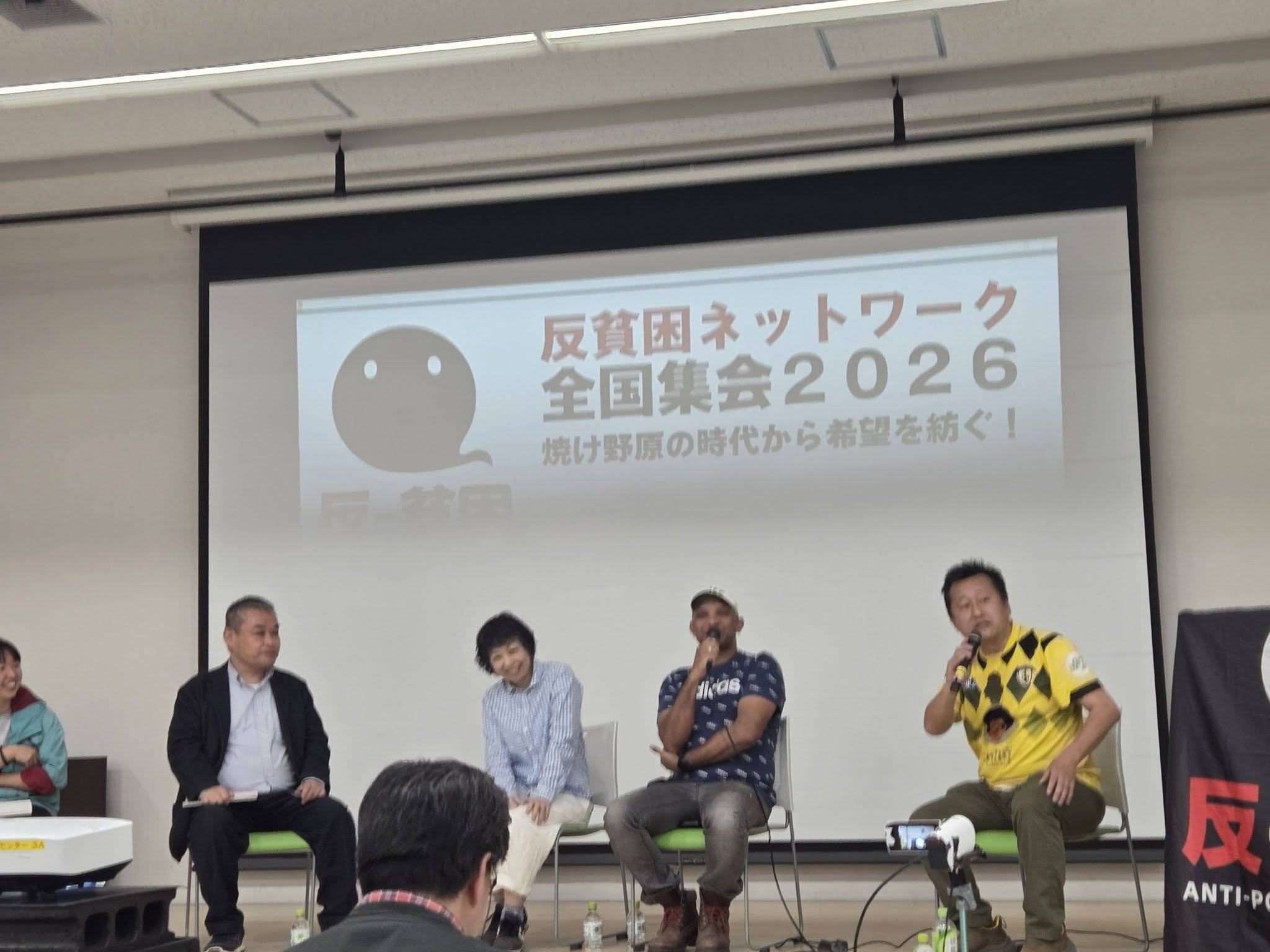 続けて私が焼け野原と化した困窮者支援の現場から1年間の状況を報告した。2025年度の特徴として年間累計で45%が女性からのSOS、女性の貧困の深刻化が際立っている。反貧困ネットワークが運営する個室シェルター26室では52%が女性、SOSを発信してくる女性の90%以上が複数の精神疾患を抱えており、かなり長期にわたって伴走を続けていく必要がある。長期の貧困格差でどんどん人間が壊されていく。無料低額宿泊所や悪質貧困ビジネスから被害のSOS、家賃滞納による強制執行での当日の駆けつけ、生活保護や年金だけでは暮らせず「もう何日も食べていない」所持金もないので駆けつける。困窮者支援の現場は「焼け野原」と化している。「福祉行政と連携していかないと立ちいかない状況になっている。