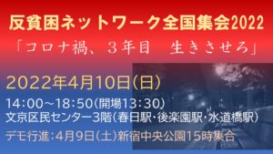 ●集会中にも3名の困窮状態にある相談者からのSOS電話、3名とも所持金も枯渇して住まいがない。集会後に反貧困ネットワークの事務所に戻り、精神的に追い詰められた女性の相談対応、ネットで見知らぬ人からお金を借り続け追いかけられている女性からの悲鳴も連続している。コロナ禍の長期化で弱き人々の多くの状態がどんどん悪化している。ここ数日、SOSが急増している。連日、テレビの画面に流れるウクライナの惨状、 乳飲み子を抱き、幼い子の手を引く母親。ごった返す避難所。少ない食料を分けあう人々…。人が人として生きる権利が壊されていく。胸が引き裂かれそうだ。