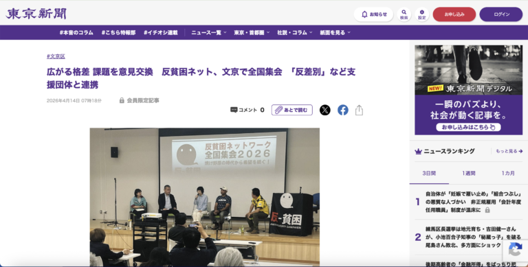 『東京新聞』2026年4月14日号に「反貧困ネットワーク全国集会」の様子が掲載さ…